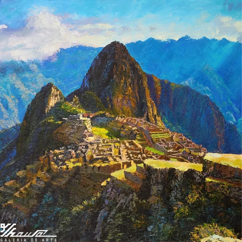 Esta impactante pintura al óleo sobre lienzo retrata con maestría la imponente ciudadela de Machu Picchu, ícono sagrado del Cusco y legado milenario de la cultura inca. A través de pinceladas expresivas y una paleta de colores intensos, el artista logra transmitir la fuerza espiritual de las montañas andinas y la profundidad histórica de este patrimonio cultural. Originaria de Cusco, esta obra no solo refleja un paisaje, sino que rinde tributo al alma viva del Perú.